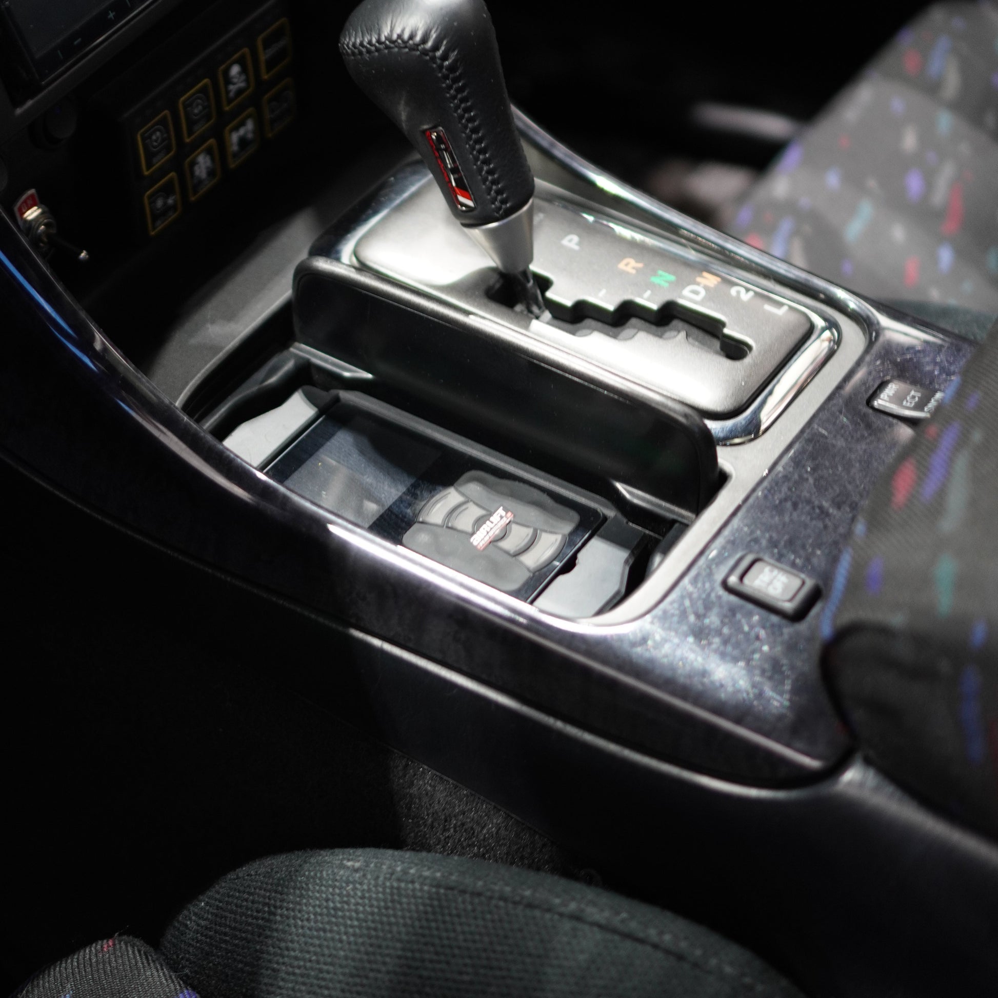 Toyota Aristo air suspension controller holder strategically hidden away inside your cup holder. Cupholder lid still closes as normal completely concealing the holder when not in use.